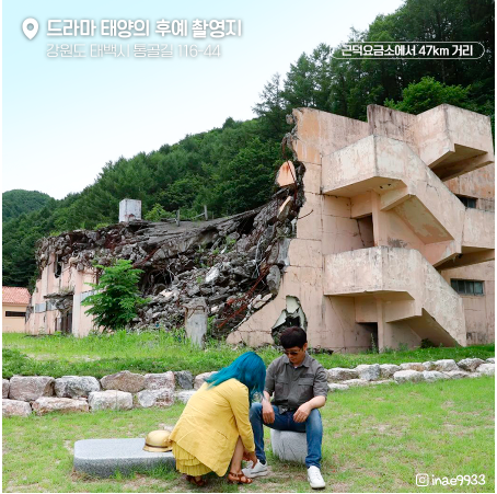 강원도 태백시에 위치한 '태양의 후예' 촬영지인 이곳은 극중에서 지진으로 붕괴된 우루크 발전소로 나왔습니다. 과거 광부들이 사용하던 목욕탕을 태양의 후예 촬영을 위해 폭파시켜 사진과 같은 모습을 연출 하였다고 합니다.