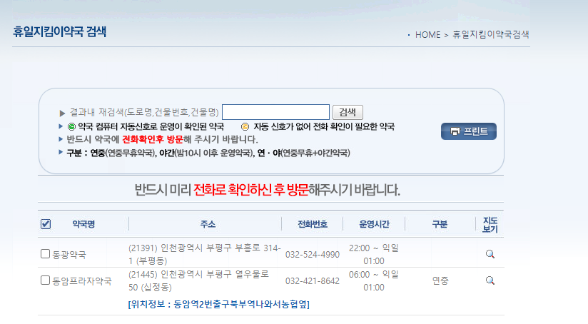 지역으로 검색 해 보면 약국명, 주소, 전화번호, 운영시간을 확인 할 수 있습니다. 혹시 변경된 사항이 있을 수 있으니 약국 방문 전에 꼭 전화로 확인 해보고 방문해보시기 바랍니다.