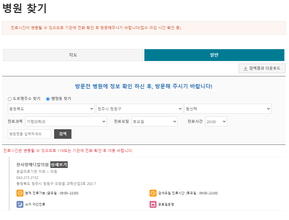 진료과목까지 선택하고 진료요일과 진료시간을 선택하면 해당 병원의 리스트가 나열됩니다.